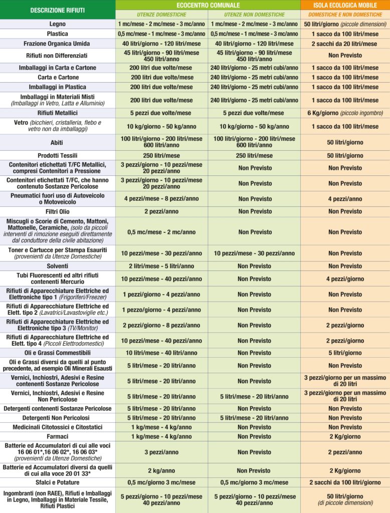 • Ecocentro Comunale: 0,5 metri cubi al mese e di totali 2 metri cubi all’anno.